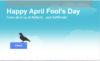 Adwords have just April fooled me. They sent me a notification that they are announcing a new feature called 'Adbirds' ads, where I can select a bird (a sparrow, a pigeon, a duck, an owl, a penguin, or an eagle) type in my ad and select my campaign and adgroups in order for the ad to "fly" around my target audience.