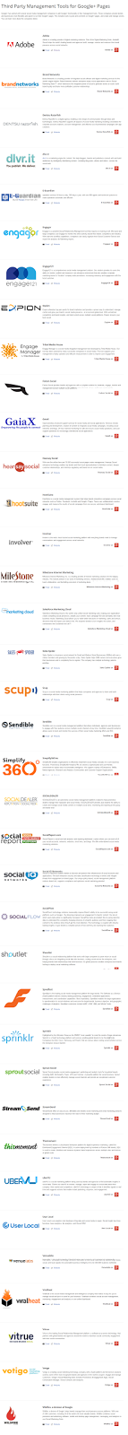 Google+ has worked with several social media management companies to add Google+ functionality in their management tools. These companies provide brands and businesses more flexibility and power to run their Google+ pages. This includes tools to post and comment on Google+ pages, and create and manage circles. You can learn more about the companies here